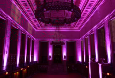 Wireless LED uplights can be placed around the room and can be set to any color to bring the room to life and set the mood.